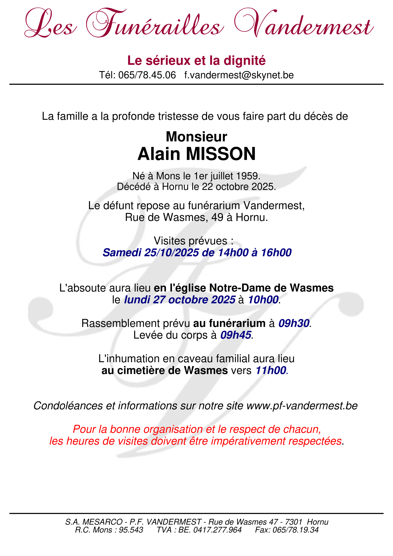 Monsieur Alain MISSON Né à Mons le mercredi 1 juillet 1959 Décédé à Hornu le mercredi 22 octobre 2025 à l'âge de 66 ans Domicilié à Hornu